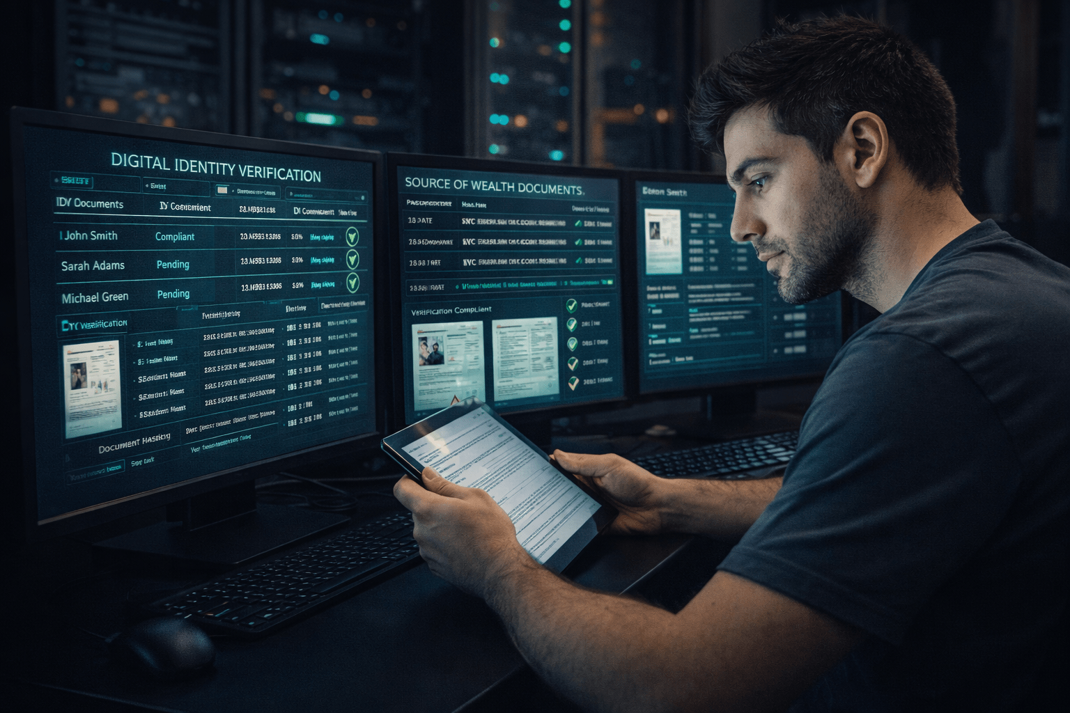 Carlos Costa Silva reviewing digital identity verification logs and Source of Wealth documents on a secure server.